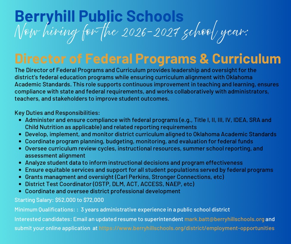 For additional information on the following openings, please write to us at the above address, call 918-446-1966 or e-mail the superintendent at mark.batt@berryhillschools.org.